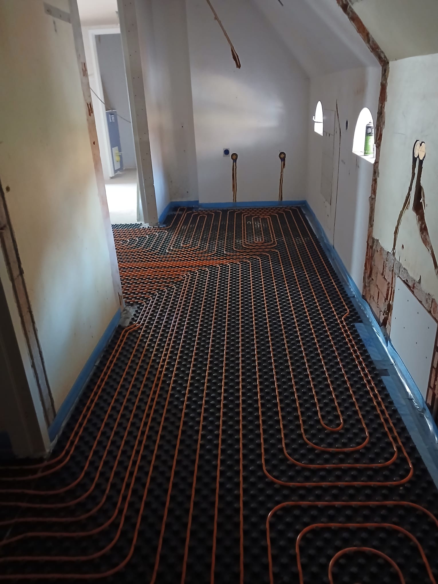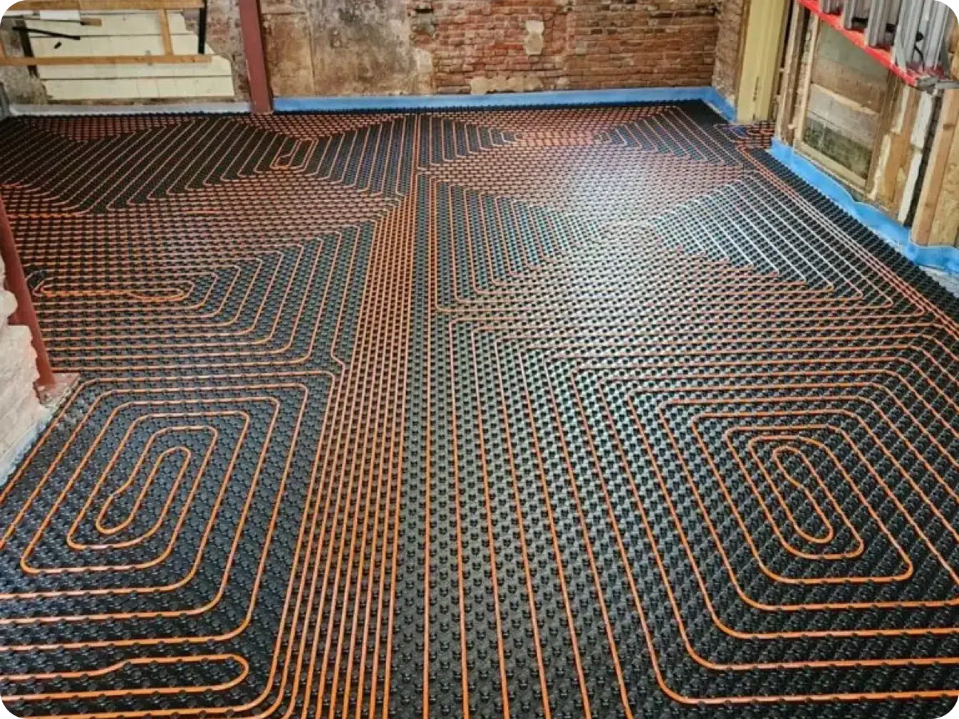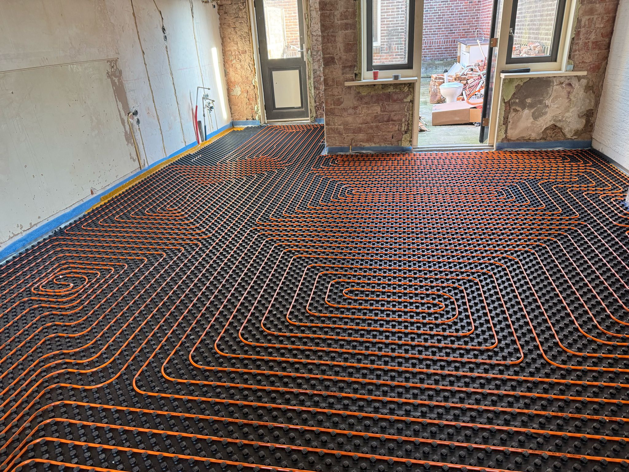 Een ultra dun vloerverwarmingssysteem met kunststof noppenmatten, 10 mm leiding en een strakke egalisatielaag. Netjes opgebouwd, snel reagerend en perfect voor renovatie.